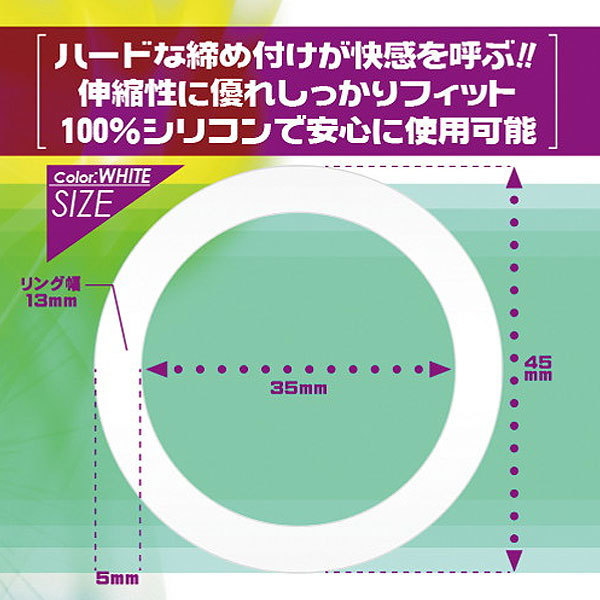 これさえあれば夜の王者になれる!ギュッと締め付けられる快感がクセになる、男性の性生活をサポートするコックリングが登場!その名も「レグノ シリコンリング ホワイト」。内径約3.5cmと大きめなリングは、伸縮性に優れた100%シリコンでつくりあげているので、どんなサイズのペニスにも相性抜群!持続力&勃起力に期待できる男性補助グッズです。
