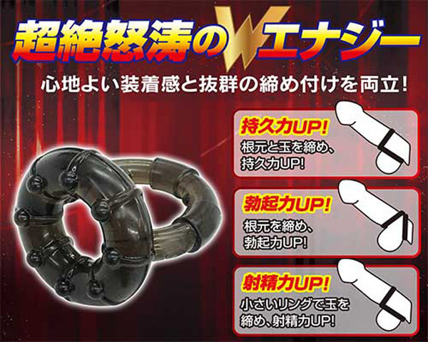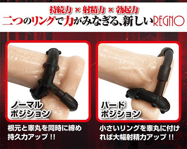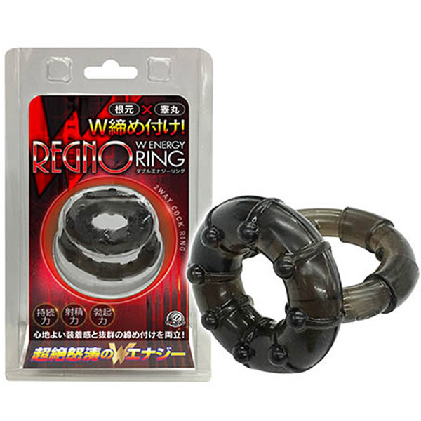 Wリングで根元を同時締め!持続力×射精力×勃起力をサポートするペニスリング「レグノ Wエナジーリング」。●大小サイズの異なるリングが合体●各内径:1.8cm(小)・2.8cm(大)●玉とサオの根元を同時に締め付け●アクセントを生むイボ突起を配置●心地良い装着感と締め付け感を両立●装着の仕方次第で様々な効果を発揮。小さめリングを睾丸側に装着すれば射精力も大幅アップ!厚みのあるダブルリングで力が漲る男性用補助グッズです。