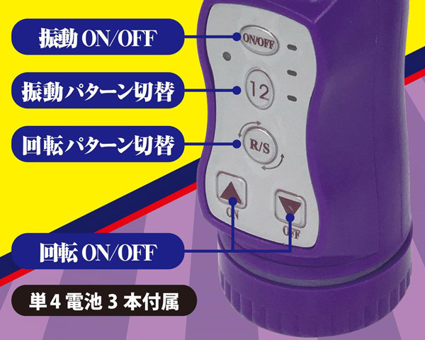 潮吹き上等!ヒィヒィいわせるパール内蔵スイングバイブ「イカす!番長バイブ パープル」。●ツルンと細身のクリアパープルボディ●自慢のカリクビ亀頭でGスポ責め●ぴっしり銀玉パールで回転責め●強力振動の玉袋型クリバイブ●12振動&3段階の回転スピード●スイングはリバース機能搭載●振動とスイングは個別に操作可能●単四電池×3本付属(動作確認用)。ワイのバットでイカせたるっ!パール&回転機能を搭載した二点責めバイブレーター。亀頭のカリはしっかりと張っていますが、挿入しやすい細身フォルムで初心者の方でも安心です。