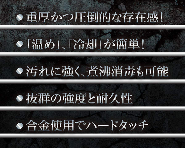 圧倒的な重量感とひんやりとした挿入感が楽しめるアルミニウム合金製のヘビー級アナルプラグシリーズ。トリプルタイプは、3つのヘッドが特徴的。段階的に拡張可能で一番小さい玉から始め徐々に拡張をすれば最終的には怪物級の圧迫感が楽しめる。また、ヘッド部分が三方向に分かれているので3Pプレイでの使用も可能…ヘッド部分は取り外し可能でお手入れも簡単。あなたの本能がいま目覚める!