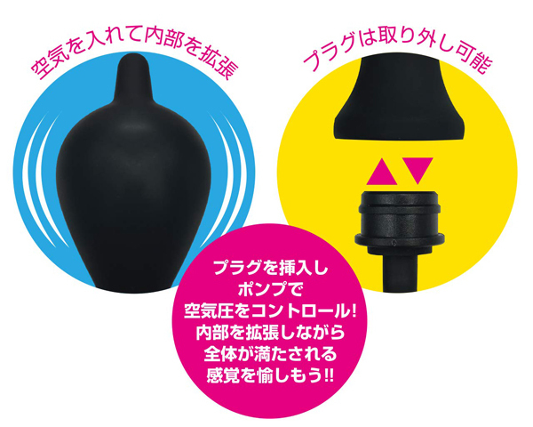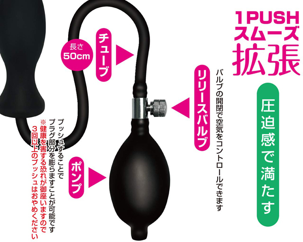 内部で膨らむ拡張プラグ。プラグを挿入しポンプで空気圧をコントロール!プラグは取り外せるので、丸洗いも可能。リッチタイプは圧迫感で中を満たす感覚がたまらない形状。内部を拡張しながら全体が満たされる感覚を愉しもう!!・丸洗いOK・滑らかな挿入感※健康を害する恐れが御座いますので3回以上のプッシュはおやめください。※健康を害する恐れが御座いますので3回以上のプッシュはおやめください。