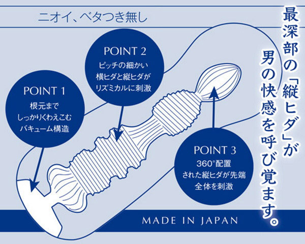 厚生労働省安全基準に合格の高品質の純国産素材「ウルトラマテリアル」を使用したことでニオイとベタつき感を極限まで無くし、しっとりと包み込む弾力感を実現。今までとは違う上質な感触をご体感いただけます。また、気泡によるクッション性が、人肌以上の弾力感を生み出しました。最深部の「縦ヒダ」が男の感覚び覚ます「バブール エッジ」根元までしっかりくわえ込むバキューム構造に加え、ピッチの細かい横ヒダと縦ヒダがストロークの度に竿全体をリズミカルに刺激。さらに最深部では360°配置された縦ヒダが亀頭全体を包みこんで刺激します。付属ローションからホールまで、すべてが日本製。ワンランク上の大人のオナホールで最高のひと時をお楽しみください。