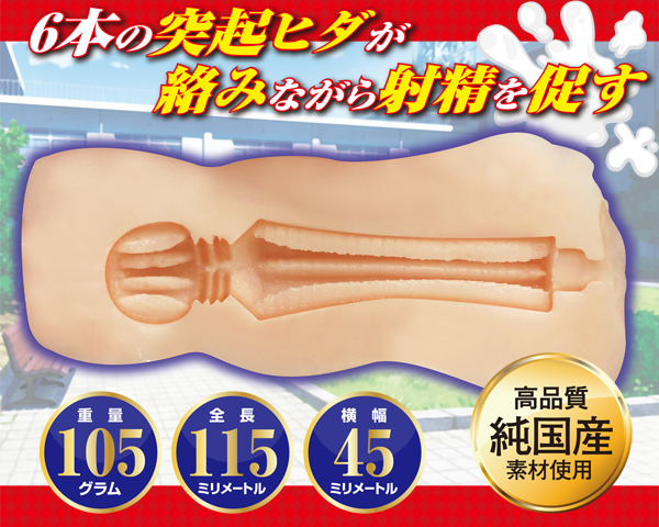無口な優等生、瑠璃子のオナホはボリューム感のある6本の突起ヒダが特徴!最奥の広がりにも突起が配置され、全体に絡みながら扱いて射精へ導きます。非貫通、純国産素材を使用、ローション付属