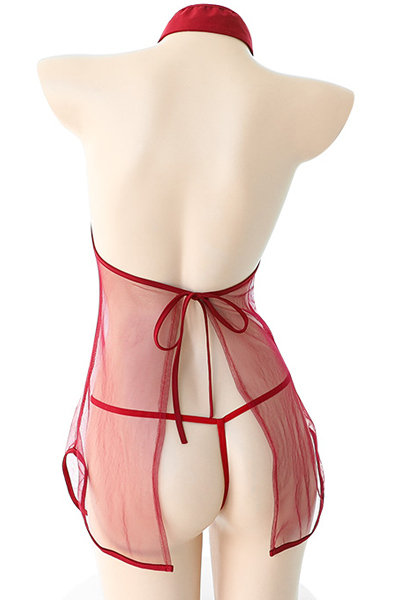 真っ赤なベールが身体を包みこむ、ノースリーブタイプの花リボン付スリット入りミニチャイナドレス。素肌を透明感のあるシアー素材で彩り艶めかしく演出!生地には繊細ながらも存在感のある刺繍を飾り付け上品に、胸元には金で縁取った花ボタンをアクセントに加えています◎着用の際はエプロンのように紐を背中で結んでください。Mサイズ、レッド