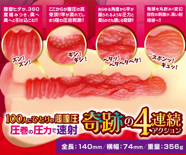 圧倒的な圧力で締め付ける!100人に1人しかいないという高膣圧感を再現した速射必至の非貫通オナホ。サオが潰れそうなほどの強烈圧力!圧迫感の中に感じる柔らかな膣道を進むと、亀頭が丸々と飲み込まれ、変幻自在な刺激で射精へ一直線♪膣壁がサオに合わせて動くという高膣圧を再現した356gの肉厚オナホ。ローション付