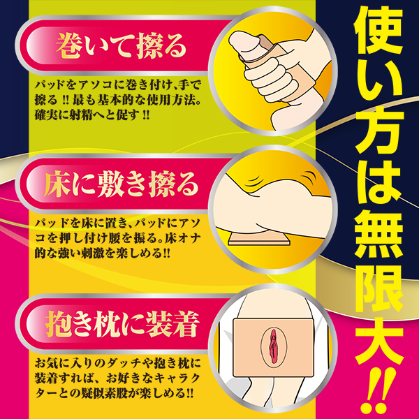 手コキをもっと気持ちよくするために開発された「チツパッド プレミアム」。リバーシブルで使えるオナシートでリアルな女性器を模った面と網目状でヒダと粒イボが配置された面で構成されています♪これを使って巻いて擦って射精へ導く!これまでのチツパッドとは違い、色鮮やかで幅広タイプとなっているのでワイドになった分だけプレイの幅も広がります♪両面使えて気ままに射精可能!使い方は簡単でチツパッドをアソコに巻いて気が済むまでシゴくだけ。パッドを床に敷くことで床オナのように使うこともできますし、等身大の抱き枕に付けてみたりと工夫次第で使い方は無限大!これを使って手コキのバリエーションを楽しもう♪ローション付属