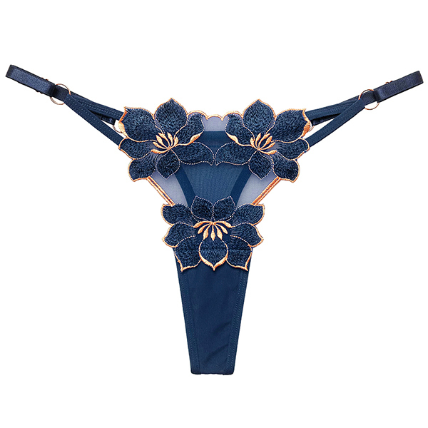 フロントには仏像の台座のような大輪の花が3つ。存在感のあるショーツです。サイドのゴムはアジャスターも付いて幅広いサイズに対応。身生地とゴムをつなぐリングは大きめで、こちらも存在感があります。●カラー:ブルー