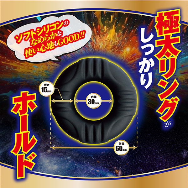 リングを装着しエネルギーチャージ。圧倒的爆発力で、すべての力を放て!攻守ともに優れたソフトシリコンリング。タマやサオ、その両方をガッチリホールドし、最後の一撃に込めるべし!<商品特徴>極太リングでしっかりHOLD!!はんぱない装着感!