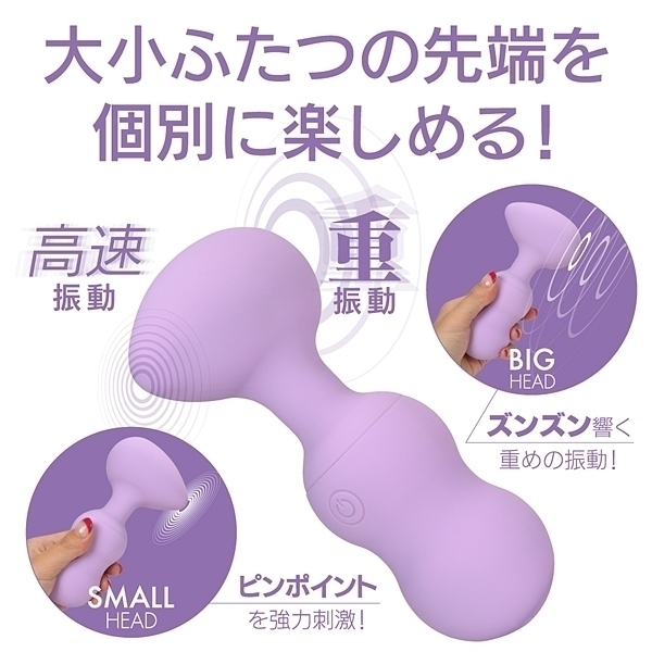 エッグ型ヘッドの左右に大小、サイズの違うモーターを配置!小ヘッドにはピンポイント用に微細振動モーターでポイント刺激を楽しめます。大ヘッドには重振動の大型モーターを搭載してデンマのダイナミックな振動を体感出来ます。電圧5Vの強力振動+高品質なオールシリコンボディだから触り心地も非常に滑らかで防水性能も完全防水を実現(防水等級IPX7)当て心地の良さを上げるフレキシブルネックの反発度にもこだわった絶品デンマです。さらに二つのモーターを個別操作出来るのでお好みに合わせて色々な楽しみ方が出来ます。もちろん同時振動も可能なので共に最強振動にした時のパワーは圧巻です。強弱も5段階に微調整が出来るので振動の好みに合わせて楽しめます。さらに5つのパターン振動も内蔵。満充電120分で最大60分使用可能。(使用環境により大幅に増減します。)●カラー:パープル