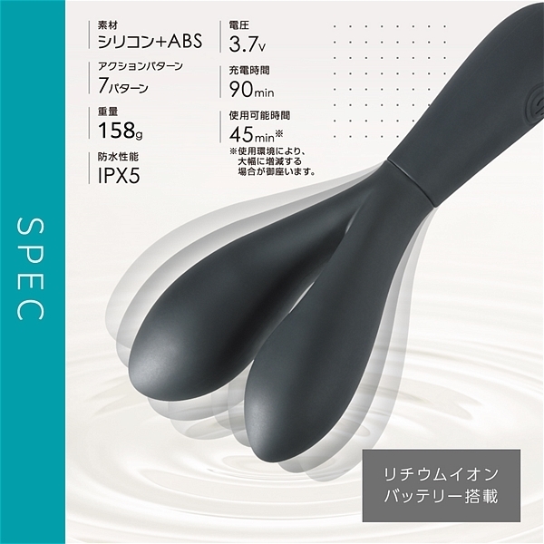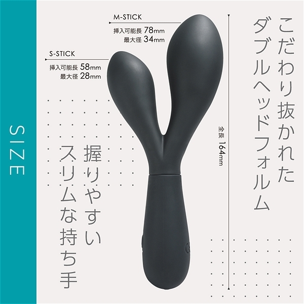 大小、サイズの異なる二つの挿入部が配置されたスティックバイブです。高品質なシリコン素材に上質な振動を演出する高性能モーターをそれぞれに搭載して、挟んだり、自分に合ったサイズを挿入してお楽しみ頂けます。IPX5の防水性能だからしっかり洗えて衛生的に何度も使用可能です。3.7Vリチウムイオンバッテリー搭載で90分で満充電、最大45分の連続使用が可能です(使用環境により大幅に増減します)。多彩で実用的な7パターン振動アクション。色んな楽しみ方が出来る高性能プレジャーグッズです。●カラー:ブラック
