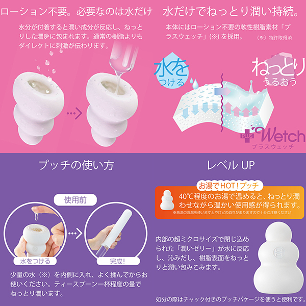 全てが新しくなったプッチ。ポケットサイズのローション不要ホールプッチシリーズが生まれ変わって新登場。軟性素材から内部の構造、パッケージ、全てが新しくなりました。デコボコ感、さらにクッキリ。今回新たに導入した「HD(High Definition)成形」で突起のデコボコ感がさらにクッキリになりました。突起に触れたときの粒立ちが違います。弾力感、さらにモッチリ。「HD 成形」により軟性樹脂の弾力性も向上。さらにモッチモチに、しなやかな素材になりました。内部構造も、さらにハッキリ。オリジナルシリーズ、スイーツシリーズ計8種類の内部構造をより精密な造形にリニューアル。「HD 成形」とあいまってデコボコ感がよりハッキリわかる構造になりました。生産工場を一新。新型プッチシリーズは日本国内に新設した工場から生産。最新の設備と厳密な品質管理で一つ一つ丁寧に作ります。ローション不要、必要なのは水だけ。ローション不要軟性素材「プラスウェッチ」水分が付着すると潤い成分が反応、ねっとりした潤いに包まれます。<オクトパス内部構造>「張り巡らされた吸盤が吸い付く」吸盤とイボが密着し快感を生み出す