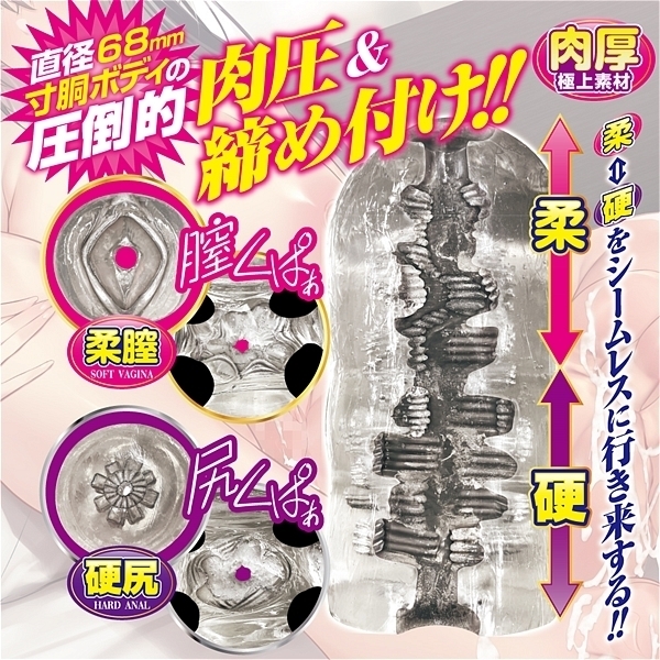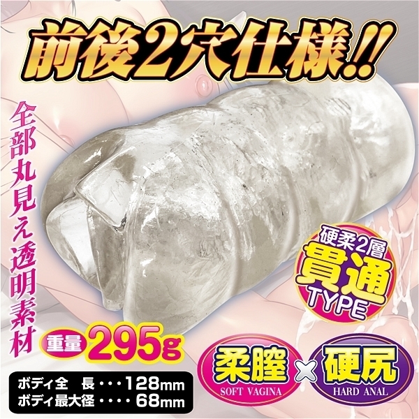 肉厚透明素材がググっと締め付ける!ソフト素材とハード素材のシームレス貫通ホール。中まですけすけのクリア素材を採用した丸見え貫通ホール。膣側の入口はソフト素材、お尻側の入口はハード素材を使用し、シームレスな硬さの変化を楽しめます。内部構造はヒダや突起を複雑に配置。四方八方から締め付けとゾリゾリ刺激を生み出します。寸胴ボディなので肉厚感を存分に楽しめるとともに、貫通型ならではの開放感と先端刺激も味わえる贅沢仕様のホールです。