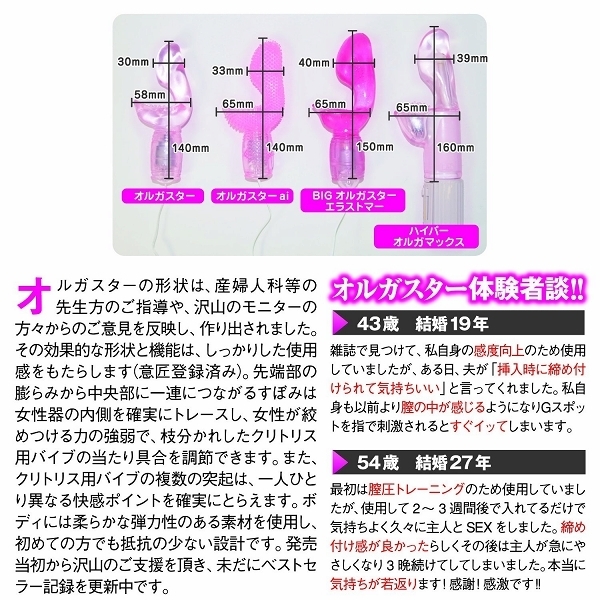 女性支持率NO.1特殊ローター「オルガスター」が更なる進化を遂げた!ファン待望の「オルガスターai(アイ)」。ジュエリーの様に煌めくイボイボBodyで、複雑な膣内にうごめきながらフィットしていく…、不思議なほどの喰い付き感を実現しました!独特のクビレと弾力のあるソフト素材で、快感スポットに強力アプローチ!