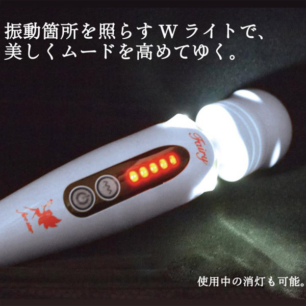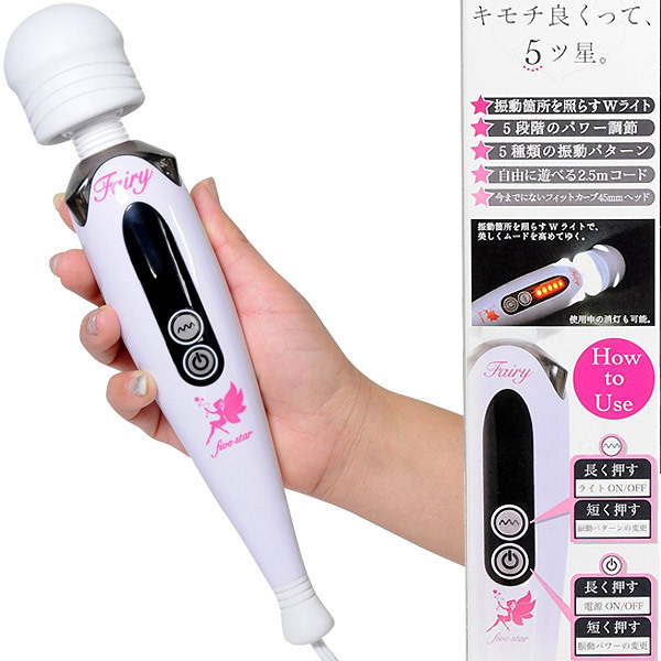 五つ星ランクの快適設計!大人気「フェアリー」シリーズの最新マッサージャー。●圧倒的な人気を誇る電マの最新作●全長26cmのフェアリーミニサイズ●フィットしやすいカーヴィヘッド●ボディの先端(2か所)にLEDを搭載●5段階強弱×5種振動=25パターン●電源ボタン:長押し→ON/OFF操作、短押し→強弱変更●波線ボタン:長押し→ライトON/OFF、短押し→パターン変更●ライト:点灯数で強弱&振動に対応した点滅でお知らせ●扱いやすい2.5mのロングコード●高性能モーターによる静音設計●45mm径アタッチメント使用可能。アダルト業界での安定した人気はもちろんのこと、一般的知名度もグングン上昇中のフェアリー最新モデル!フィットカーブを採用して密着しやすくなったヘッドに魅力的な多彩パターンが嬉しい最強フェアリー電マ。フェアリーミニをはじめとする45mm径のアタッチメントカバーを装着できるのも嬉しいポイントです。