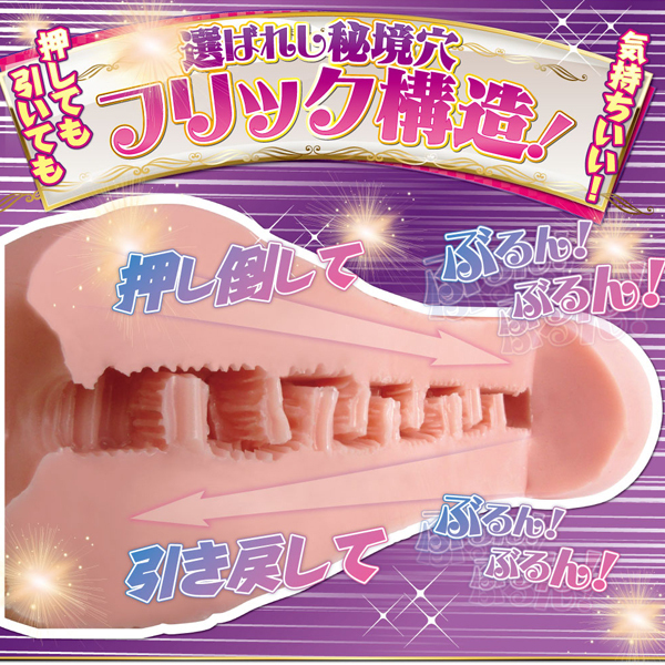 上から下から乱れフリック!押しても引いても気持ちイイ、フリック構造です。フリック刺激が行ったり来たり。押しフリックでぶるんっ!引きフリックでもぶるんっ!選ばれし秘境穴で肉ヒダ壁が天地でペロンペロンと乱舞。フリッカーの絶妙な間隔で成し得る、この不思議感触。倒して突入!ペロンっとバック!新感覚フリックスタイルをお試しあれ。