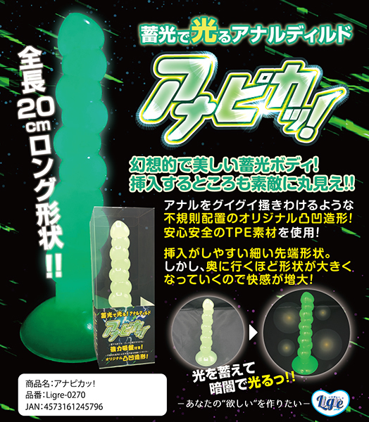 蓄光で光るアナルディルド「アナピカッ!」の登場です!アナルをグイグイとかき分けるような凸凹形状!素材はTPEなので人体にも安心安全です!暗闇でピカッと光るアナルディルド!とっても幻想的で美しい!挿入するところも素敵に丸見え!先端は挿入しやすい作りで、奥に行くほど球が大きくなる!この凸凹形状が最高に気持ち良いのです!さらに200mmのロング形状なので、挿入感も大満足の一品!アナピカッでアナルプレイを楽しもう!