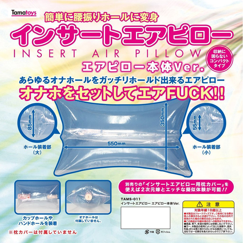 お手持ちのオナホールをセットするだけで、簡単に腰振りオナニーが出来るタマトイズのエアピロー。●大小二つの挿入穴を本体上下に配置●本体サイズ:55cm×35cm●ホール装着穴(大):8.5cm●ホール装着穴(小):5.5cm●保管にも便利なコンパクトタイプ。カップホールやハンドホールなど様々なサイズに対応可能。別売りの「インサートエアピロー用枕カバー」を装着すれば、二次元嫁とのリアルな疑似H体験が楽しめます。●メーカー型番:TAMS-011※オナホール、枕カバーは付属しておりません