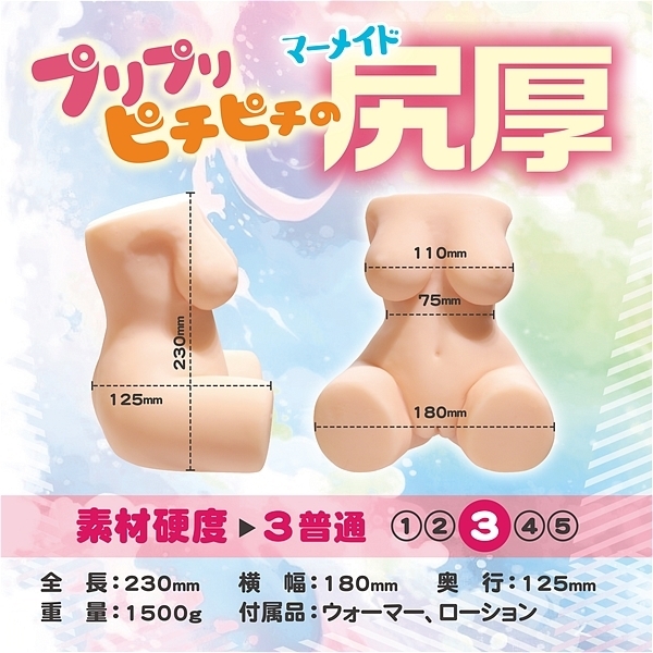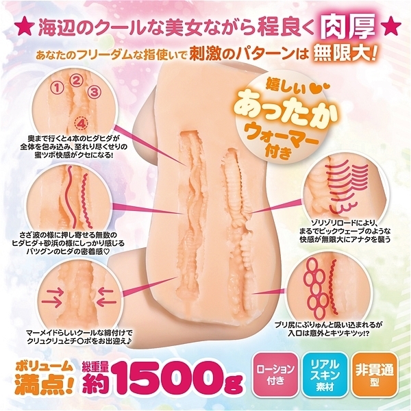 浜辺のクール美女を独り占め。ゴージャス二穴構造?蜜ツボ×プリ尻のクールビューティのマーメイドヒップを再現!<ヴァ○ナ>・マーメイドらしいクールな締付けでクリュクリュとチ〇ポをお出迎え♪・さざ波の様に押し寄せる無数のヒダヒダ+砂浜の様にしっかり感じるバツグンのヒダの密着感?奥まで行くと4本のヒダヒダが全体を包み込み、至れり尽くせりの蜜ツボ快感がクセになる?<ア○ル>プリ尻にぷりゅんと吸い込まれるが入口は意外とキツキツッ?ゾリゾリロードにより、まるでビックウェーブのような快感が無限大にアナタを襲うボディは230×180ミリ、1500グラムと程良く肉厚ながらも動かしやすいサイズで正常orバックor座位、その日の気分で楽しめる!浜辺のクール美女のプリプリ、ピチピチのマーメイド尻厚&極上締付けを堪能しよう!肌に直接触れるものだから、安心安全の日本製あって嬉しいあったかウォーマーも同梱!
