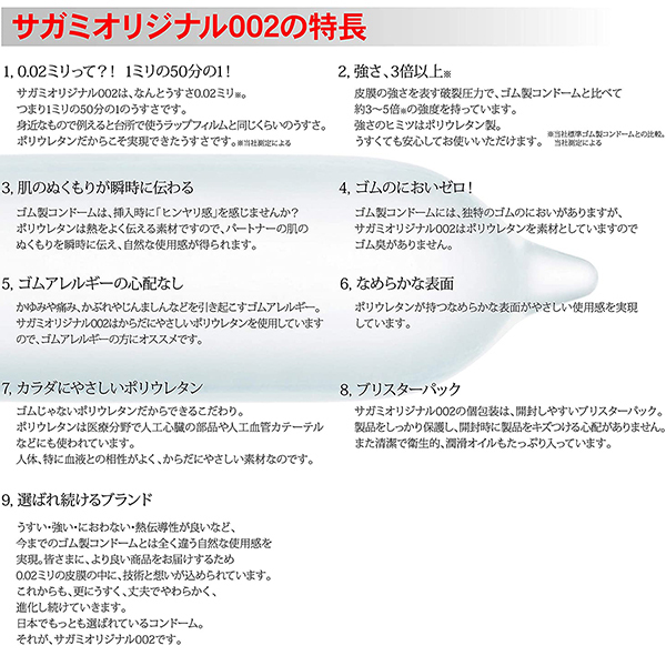驚きのうすさ0.02ミリ!ゴムじゃないコンドーム「サガミオリジナル002」20個入り。人工心臓の部品や人工血管カテーテルなどにも使用されている、生体適合性の高い特殊ポリウレタン素材を採用したコンドーム。わずか0.02ミリのうすさながらゴム製コンドームよりも強度が高く、ゴム特有のニオイもないので天然ゴムアレルギーの方にも安心してお使い頂けます。熱伝導性に優れているので、肌のぬくもりが瞬時に伝わり「生」の挿入感を味わえます。開封しやすく、清潔で安全なブリスターパック入り。