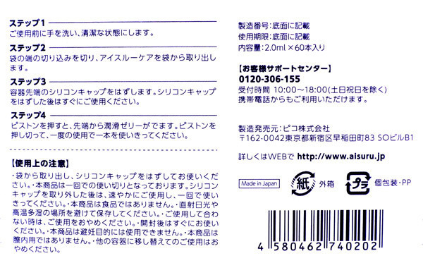 まとめ買いにも便利な業務用60本入り!潤い不足で悩む女性の為の潤滑ローション「アイスルーケア」。●ワンタッチで注入できる注射器タイプ●一回使い切りの個包装で衛生的●自然に潤う無香料・無着色●身体にやさしい成分を配合した弱酸性。注射器型のプラスチック容器だから、手を汚さず注入出来てとっても衛生的!口に入っても大丈夫な無味無臭なので、安心してお使い頂ける日本製の潤滑ゼリーです。