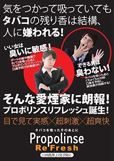 <成分>水、エタノール(溶剤)、グリセリン(湿潤剤)、PEG‐60水添ヒマシ油(可溶化剤)、プロポリスエキス・チャ葉エキス・ユーカリプトール・オタネニンジン根エキス・シャクヤク樹皮/樹液エキス・キシリトール・メントール・サッカリンNa(香味剤)、クエン酸・クエン酸Na・リンゴ酸(pH調整剤)、カラメル(着色剤)、メチルパラベン(保存剤)、香料