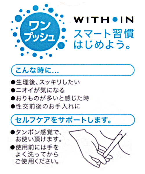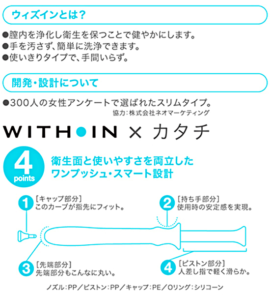 手を汚さず衛生的!ワンプッシュで膣内を洗浄できる、日本製の使い切り膣洗浄器10本入り。性交前後のお手入れや、生理やオリモノなどの気になるニオイに♪デリケートゾーンを内側から洗浄します。安心成分だけを厳選し、使用感はとってもナチュラル◎スリムタイプなので挿入が苦手な人でも安心!ウィズインで膣ケアをして日頃の不快感から解放されよう♪管理医療機器