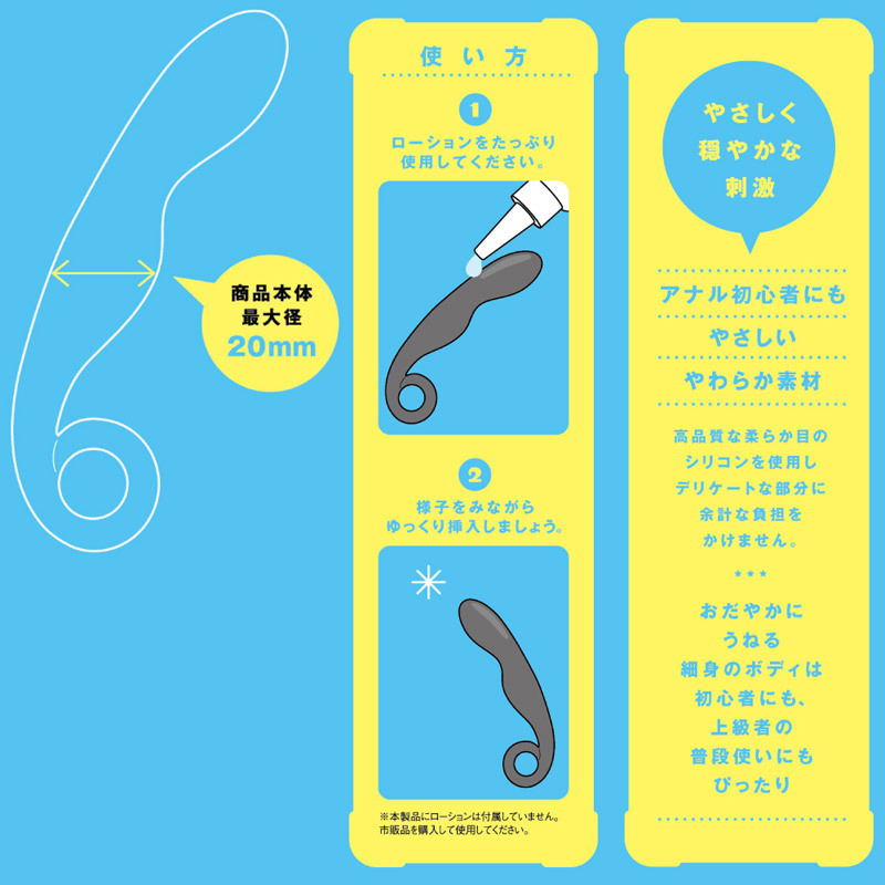 お尻にちょうどいい柔らかさ!直腸内でうねりやすい、細身のブラックシリコン製アナルプラグ。指かけリングがストッパー代わり!ゆるいウェーブが前立腺にも優しく当たる、最大φ20mmのアナルプラグです。丸洗いできるので、使用後のお手入れが簡単!汚れも目立ちにくく、初心者でも入れやすい太さです。男女兼用、普段使いにどうぞ。※アナルローションは付属しておりません。
