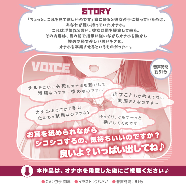 「ちょっと、これを見て欲しいのです」家に帰ると彼女が手に持っているのは隠し持っていたオナホ。罰として彼女の目の前でオナニーをする事になるあなた…。バイノーラル録音で、実際に目の前で囁かれているような超臨場感!?CV:杏子御津様の可愛いお声によるオナサポ音声です♪「あなたはもう、私が「いいよ」っていうまで絶対逝ったらだめなのです」「お耳を舐められながらシコシコするの、気持ちいいのですか?」「サルみたいに必死にオナホを動かして、滑稽なのです…」「オナホを動かす手は、止めちゃ駄目なのですよ?」あなたの行動は管理され、出したいタイミングで出すことも許されない…最後は耳舐めをされながらのフィニッシュで、今までとは違った快感を…時間:61分※オナホを用意してから視聴して下さい。