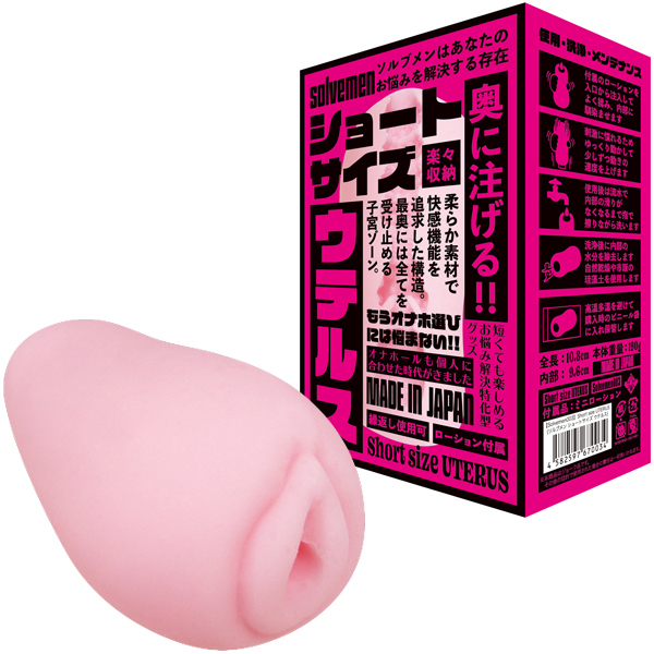 「もっと奥を突きたい…」そんなSサイズの男性の悩みを解決!短くてもウテルスへ到達できる全長10.8cmの非貫通オナホ。一般的なサイズと比べて小さめサイズなので、奥にある子宮口までしっかり届き貴男の全てを注ぎ込める!ショートタイプながらも肉感ばっちり♪まったり生感が感じられるイボ膣壁によるリアルな快感を是非お楽しみください。ローション付属、日本製、繰り返し使用可能