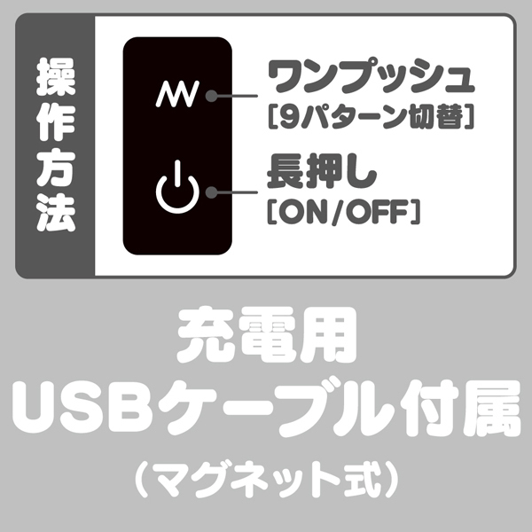 パッケージ:17.5×12.5×6.0cm 本体:13.4×3.6cm 重量:90gUSB充電式