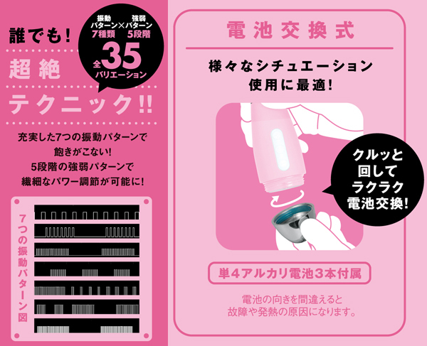 最強の電マ、降臨!振動パターン7種類!強弱パターン5段階!全35バリエーションの多機能!使い勝手のいいちょうどいいサイズと軽さで実用性を向上させました。首がクネクネ360°回転!色々な箇所に色々な角度で当てられます。直接肌に触れるものなのでなめらかで優しい肌触りの高品質シリコンを使用しています。すぐに使える電池式電マ。ぜひ試してみてください♪