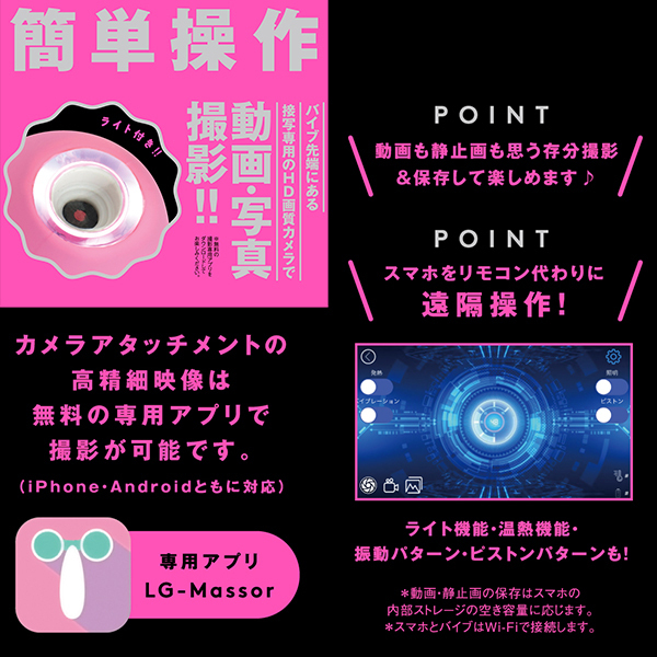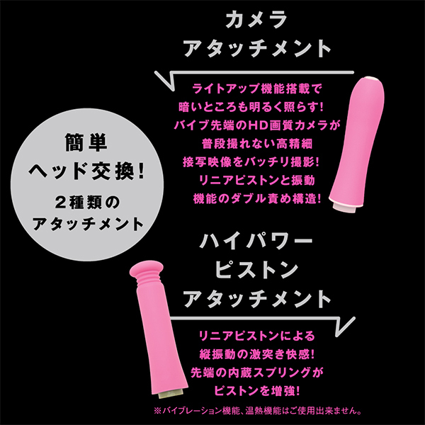 あの娘のナカや奥まで見えちゃう♪バイブの先端にアソコを接写できるHD画質カメラを搭載した高機能なバイブ「CAMERA PISTON VIBE 90(カメラピストンバイブ90)」です。ライトアップ機能がついたアタッチメントで動画撮影や写真撮影も楽しめる!パートナーのあそこのナカを見たい欲求を満たしてくれるとともに、温感を楽しめるバイブとしても優秀なのでハイパワーピストンとリニア式のピストンアクションで極上の快感を体験できます♪お好みのリズムで感じられる9パターンのバイブ振動にリニア振動による重厚な奥突きピストン10パターン!高品質シリコン仕様でやさしい肌触りを確かめながら、温熱機能搭載で人肌感覚のぬくもりもお楽しみ頂けます。2種類のアタッチメントで簡単ヘッド交換、飽きのない充実機能!本体は充電式で充電時間約210分。最大連続稼働時間約70分(初期振動パターン未変更時)です。生活防水機能付き。付属品はアタッチメント、USBプラグ式充電コード。※カメラ機能は無料の撮影専用アプリをダウンロードしてお楽しみください。