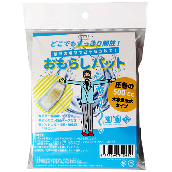 これさえあればどこでもスッキリ開放!禁断の願いを実現する「おもらしパット」でいつでもどこでも「おもらし」をすることが出来ちゃいます♪圧巻の500cc大容量吸水タイプ!多い日も安心で、抗菌消臭ポリマーを配合したパットになっているため、プレイ後の後始末も簡単です。ズレ防止テープ付きで下着のセットもラクラク♪消臭袋も付属しているのでシャーッとどこでも開放していただけます!【使用方法】@パットを開きズレ止めテープの付いている方を前にします。Aズレ止めテープを剥がし下着(ボクサーパンツまたはトランクス)に貼付け尿を吸水できる位置にセットしてください。B下着を引き上げズボンを履いてください。C使用後は付属の抗菌・消臭袋に入れて廃棄します。