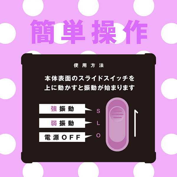 軽くて小さくて使いやすい!スティックローター感覚で使えるコンパクトな電マです。ビギナーさんに使って欲しいタイプで、簡単操作でお買い求めしやすい価格帯!「はじめて」に選んでほしい電マとなっています♪コンパクトボディーでもしっかりイケる強振動!誰でも簡単に操作できるシンプル設計でワンボタンでオンオフと振動の強弱を簡単操作♪ヘッドの素材はプラ系でネックの動きは軽快!電池を入れた状態でも90gの軽量設計ですので、使いたいときにすぐに楽しめます。便利な電池交換式で単4電池2本(付属)。こちらはパープルカラーです♪