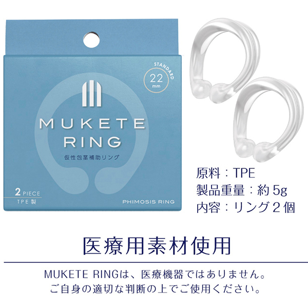 抜群のフィット感、仮性包茎補助リング!!優しいフィット感、安心の2個入り、おやすみ用に最適です。医療用素材を使用し高品質で安全にご使用いただけます。●スタンダードタイプ※MUKETE RINGは医療機器ではありません、ご自身の適切な判断の上でご使用下さい。