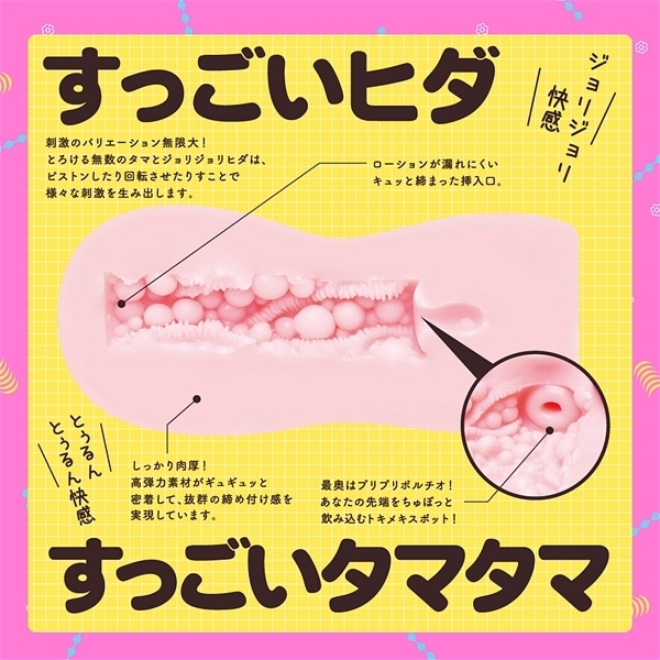 ジョリジョリ刺激と猛烈なヒダによる快感!とぅるんとぅるんのすごい快感♪正反対の2つの刺激が奇跡のコラボレーションを遂げた非貫通オナホ「極たまヒダばーじん」です!摩擦ZEROのなめらか極玉密集地帯を縦横無尽にうねり走る極太の肉ヒダが凄まじい♪ぷにゅぷにゅと蕩けながら遅い狂うようなジョリジョリ刺激!これはまさに未体験の絶対快感♪ピストンしたり回転させたりすることで刺激のバリエーションが無限大に広がります!覚醒型素材「GROW UP SKIN」を採用し、使えば使うほどにあなたに馴染んで成長する人肌感覚の高弾力素材が心地良い♪直接肌に触れるものだから安心の国産素材を使用!パッケージイラストは人気絵師すーぱーぞんび氏を起用。ベタツキなしでニオイなし!相反するツンデレ快感をぜひお試し下さい。