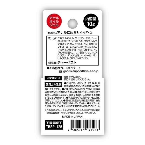 ア●ルプレイにぴったりのオイルが登場!ジェルを手に取って塗ると人肌の温かさでオイル状になります。パートナーとのプレイはもちろん、ア●ルグッズ使用時にもお薦め出来る優しい使い心地のオイルジェルです!安心安全の日本製!!