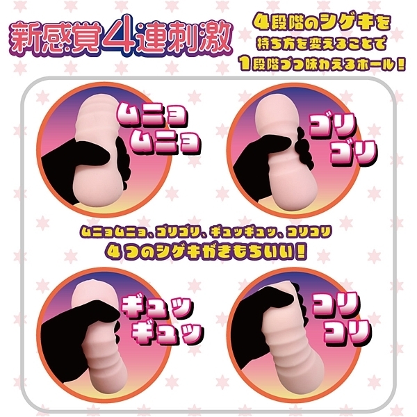 新感覚のホールが誕生!持ち方によって刺激が変わる新感覚ダンベルタイプ!挿入時、ムニョムニョとした入り口から内部に入るとゴリゴリとした刺激に変化!さらに待ち構えるギュっギュっとした仮締めゾーンが首元を攻める!そしてその先にある無重力空間が生み出すコリコリしたフェザータッチが新しい世界への扉を開く!ムニョムニョ、ゴリゴリ、ギュっギュっ、コリコリと4段階を持ち方を変えれば1段階づつ味わえるホール!
