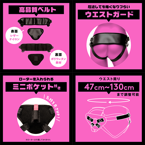 イキかた、責めかた、∞(無限大)!!男性凸女性凸男性凹女性凹色んな組み合わせが楽しめるペニバンです!ディルドはスナップボタンで4箇所留めしてしっかり固定!ベルトを引っ張るだけでフィットする簡単装着!シリコンリングが4種類も付いているのでディルドのサイズに合わせて装着が可能!ポリウレタン素材、レザーナイロンを使用した高品質なベルトを採用し、圧迫しても痛くなりづらいウエストガード付き。ペニバンの裏にはミニポケットが付いていてローターの装着が可能、気持ち良さがUP!勃たない時のフォローに!椅子や抱き枕に装着して推しとの妄想H、見せつけプレイに大活躍!(まわし仕様じゃないので装着可能です)胸元に装着して直視させる変態プレイも♪ウエスト周り43cm〜130cmまで調整が可能です。※ディルドの吸盤はレザーナイロンにフィットしづらい仕様となります。ディルドを更にしっかり固定したい場合は、補助版を挟んでご使用ください。※ディルド・ローターは付属しておりません。ぷにっとりあるディルドの使用をオススメいたします!※本商品が汚れた場合は、濡れたタオルで拭いてお手入れをしてください。