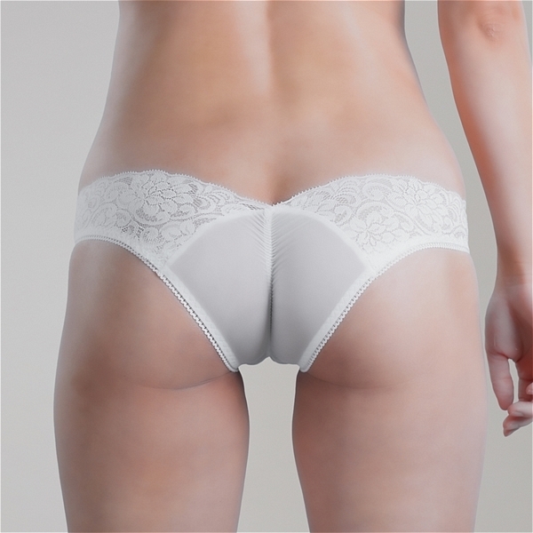 日本国内の工場で縫製され、国産のストレッチレースと伸縮性と透明性の高いストレッチ生地を組み合わせたハーフバックショーツです。中央のシャーリングゴムによってクロッチラインに沿ってくい込むようにデザインされています。●カラー:ホワイト