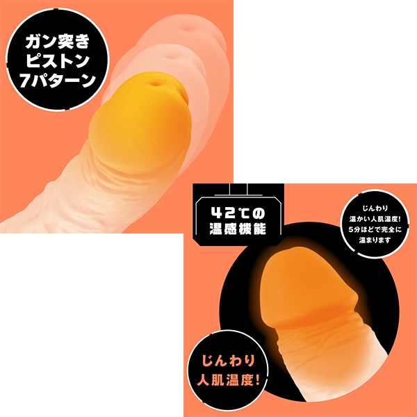 超絶リアル造型で本物セックスを楽しめるピストンバイブが登場!温熱機能は人肌より高めの42℃設定にすることで、興奮したアソコの熱感を再現!日本人男性の平均的なサイズ感なので、かなり本物に近いプレイが楽しめます!振動付きなので快感倍増!ぷにっと柔らかなソフトシリコン仕様です。ピストン・振動7パターン&生活防水&充電用USBケーブル付属。