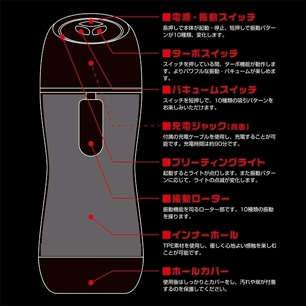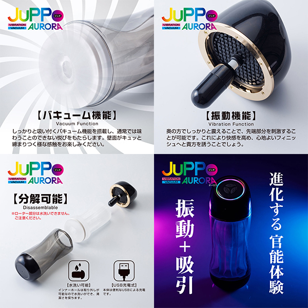 強力な吸引と振動で大人気のJuPPoが送り出す新たな官能のカタチ。今回のJuPPo AURORAはターボ機能が加わり、より一層の密着感と振動感をお楽しみいただけます。簡単な操作でリアルを超えたプレイをお楽しみください。本体は簡単に分離が可能なので、使用後は速やかにインナーホールを外し洗浄が可能です。充電は本体背面にある充電ポートに付属のUSBケーブルを挿してください。振動と吸引で導く新たな官能体験。ぜひ、ご堪能ください。