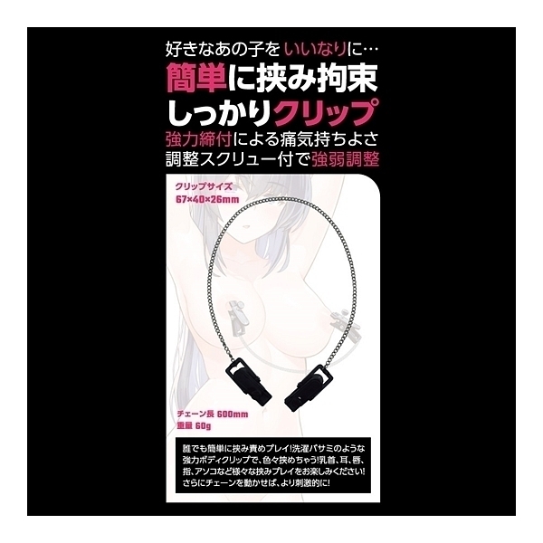 好きなあの子をいいなりに……。SMプレイを盛り上げるアイテム、SM専用クリップ「SM拘束ボディクリップ」!両乳首からチェーンが伸びるその姿は、艶やかな官能的ファッション。SMプレイにとって大切な「痛気持ちよい」を演出するSMアイテムです。クリップ部分は本格構造で、時には痛いほど強力に、時には摘むように弱く、様々な拘束シチュエーションをばっちりフォロー。洗濯バサミのような外見の通り、締め付ける力はとっても強めです。今までのボディクリップでは満足できないエキスパートも、きっと楽しんでいただけるはず。もちろん、ビギナーの方でも大丈夫なように、開口サイズを調整できるスクリュー付き。アナタのお好みな締め付けまで適切に調整できます。クリップの使用する箇所も乳首だけでなく、耳や唇や指やアソコに、と場所を限定せずに色々にお使いいただけます。クリップで挟んで拘束する、痛気持ちよさがSMプレイの興奮を煽ります!