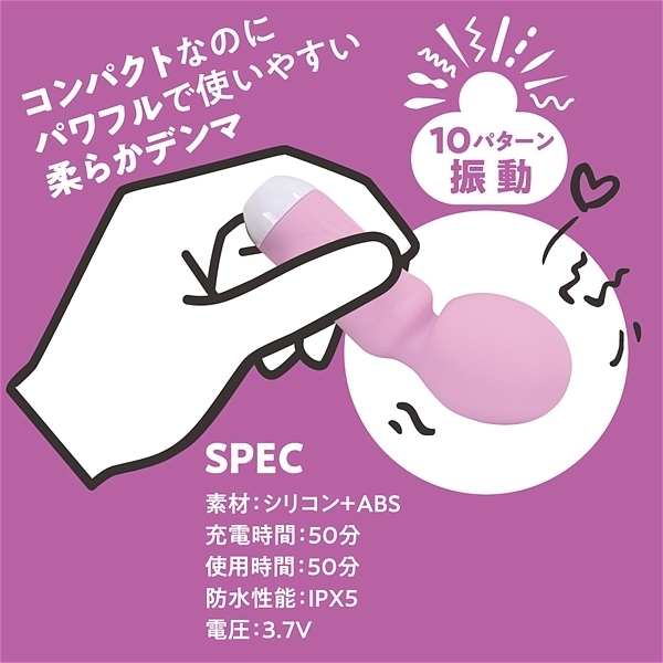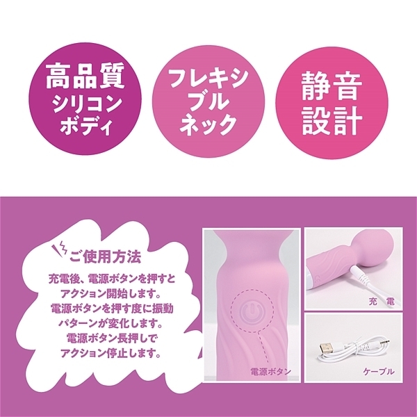 驚く程肌触りが滑らかな高品質シリコン素材にフレキシブルネックと静音なのにパワフルな高性能モーターを搭載したコンパクトサイズデンマです。最大使用時間50分のリチウムイオンバッテリー搭載。強弱調整を含む実用性の高い10パターンの振動で見た目の可愛さからは想像出来ない使用感を実現しました。IPX5の防水性能だからしっかり洗えるので衛生的に楽しめます。●カラー:ローズ