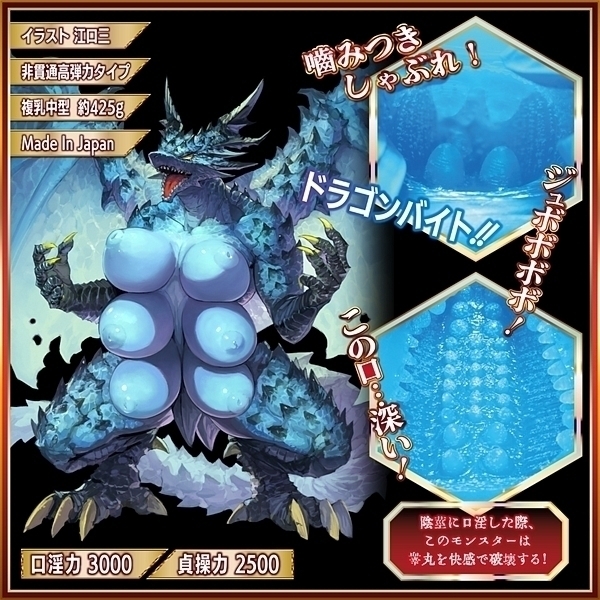 トルソーオナホは数あれど、複乳オナホは見たことあるかい!?龍の牙がチ●コをしゃぶる!太古のフェラチオドラゴンが目を醒ます!ただのフェラチオじゃない。ド級のフェラチオ、ドフェラチオだ!友達と遊び終え自宅で自慰に耽る少年。そう、実はこのカードで少年は性欲を覚えてしまった!勃●する自分に戸惑いながらもアソコに触れると気持ちイイ…。次第に興奮が高まり初の精通を迎えたその瞬間!純粋なる少年の精通精液がカードにかかったことで封印が解かれてしまう。恐ろしい咆哮を上げカードに描かれたドラゴンが実体化。腰を抜かす少年のアソコをドラゴンがすかさずしゃぶる!「んほぉおおおおおおおん!」少年は未知の快楽に思わずドラゴンの咆哮を真似てしまう。人生初の精通、射●フェラチオ。彼の性癖はドラゴンで歪んでしまった!もはや普通の人生は送れないが、彼とドラゴンの絆は誰にも邪魔されることは無いだろう。