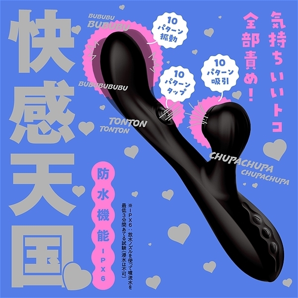 1台3イキ奥・Gスポ・クリを同時責めできる欲張りバイブ!曲がった形状が奥にぴったりフィット!重振動で奥イキ開発!Gスポをトントンと刺激する高速タッピング機能はまるで手マンされているかのような極上快感!激しく吸い上げるバキューム吸引&クリをツンツン刺激する舌付き!震えて叩いて吸って3in1!気持ちいいトコロを全部責められる快感天国を体験してください。本体:充電時間約120分、本体:最大連続稼働時間約50分(初期振動パターン未変更時)。防水機能IPX6等級、付属品:USBマグネット式充電ケーブル※IPX6:放水ノズルを使って噴流水を最低3分間あてる試験(浸水は不可となります)