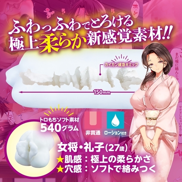 FANZA同人で人気の作品「Go To コヅクリ〜おれが過疎化の進む田舎の村で適齢期の女たちへの種付をお願いされたワケ〜」とmousou-toysとのコラボ作品。夫公認で、本物の肉棒を求めて淫らな本性をさらけ出す若女将「礼子」。重量約540グラム、全長約180mmと肉厚たっぷりの柔らかハンドホールです。ふわっふわでとろける真っ白な極上柔らか素材が優しく包み込みます。入り口付近の巨大俵イボの先に進むと四方から突起イボが更に刺激!緩急のある引っ掛かりゾーンの先にあるフィニッシュゾーンではイボ壁と長い突起が蠢くように刺激!業界最上位クラスの柔らかさなのでまったりと楽しめます。更に捻ったり回転させたりしながらストロークをする事によりより高刺激を楽しむ事が出来ます!