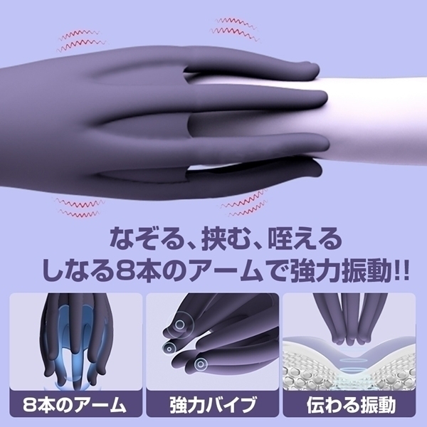 進化した8本のアームでしなりが強化。伝わる振動!!柔らかな医療用高品質なシリコンを採用。8本のアームが中心部の強振動バイブレーションを伝って躍動します。弱強振動、リズム振動をワンボタンで操作。全10モードをお楽しみいただけます。カップルでもセルフプレイでも楽しめるユニセックスプレジャーアイテム。<内容物>本体、USB充電器<充電時間>1時間<可動時間>2時間