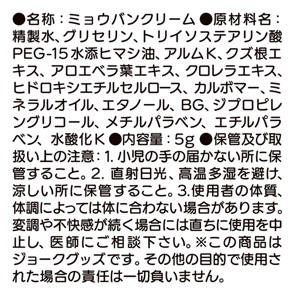 やさしく塗り込むだけでリラックスをサポートする女性用クリームです♪アロエやハーブ由来の保湿成分を配合し、敏感な部位にもなじみやすい設計になっています!しっとりとした塗り心地で、じんわり広がる感覚が心地よさを演出します♪使用方法は簡単で、適量を手に取り気になる部分にやさしく塗布するだけ!パートナーと一緒に使う際は、必ず相手の同意を得てからご使用ください♪持ち運びに便利な5mlサイズで、旅行や外出時にも活躍します!日本製で成分や製造にもこだわり、安心して使える仕様です♪普段使いのケアや特別なシーンでのサポートとしてもおすすめです!ジョークグッズとしても楽しめる、気軽に使えるアイテムです♪