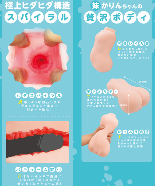 むっちりな妹にもっちり包まる!重量級の肉厚オナホ「いかばらしすたーず」!ぽっこり胃下垂なおさないボディといえば「いかばら」。その「いかばら」をイメージさせる肉厚腹×キツ締付のオナホールです!だらしないその肉付きがとっても可愛くてたまらない!むっちりもっちりな柔肌に包まれるこの肉快感!肉厚と相性の良いキツ締め内部構造!ずっしりボリュームと搾り取れる内造形にもうヤミツキ!「妹 かりんちゃん」は、まさにタイトルそのままのようないかばらトルソーボディ!見ても良し触っても良し挿れても良しで大興奮!ひかえめちっぱいにぷっくら胃下垂腹、可愛い首筋やソソる背中と、フィギュアのような美クオリティ!重さもずっしり1050グラム!片手じゃ溢れちゃうから両手で大切に持ち上げてネ♪内部構造は最深部に子宮口もあるリアルシミュレートタイプ!渦巻くようにぎゅるぎゅる締め付け&絡み付け刺激にクポクポあたる贅沢な子宮口!スパイラルな凹凸ヒダが最深部まで導いて、おさないキツキツ膣道によるバキューム感!極上ヒダヒダ構造のスパイラル!可愛い姉妹を、たっぷり愛してね♪ミニローション付き